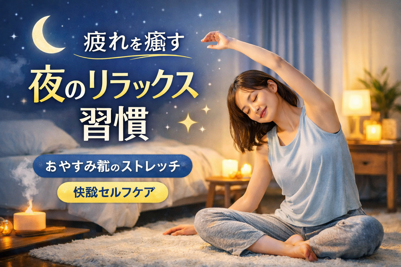 寝る前に体をゆるめる5分を入れるだけで、翌朝のコンディションが変わります。この記事では、忙しい人でも続けやすい夜ケアをまとめました。